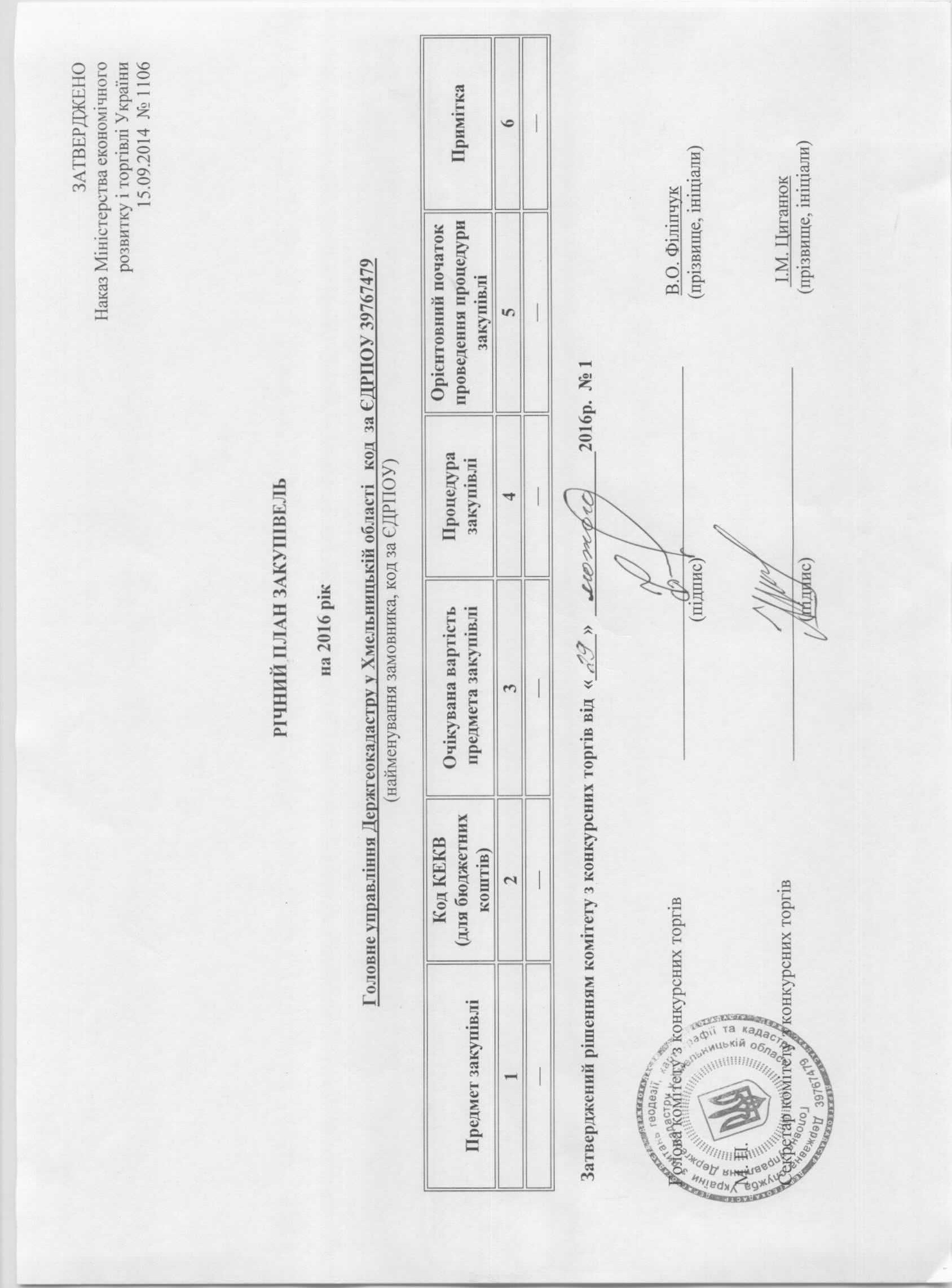 Річний план закупівель ГУ Держгеокадастру у Хмельницькій області на 2016 рік